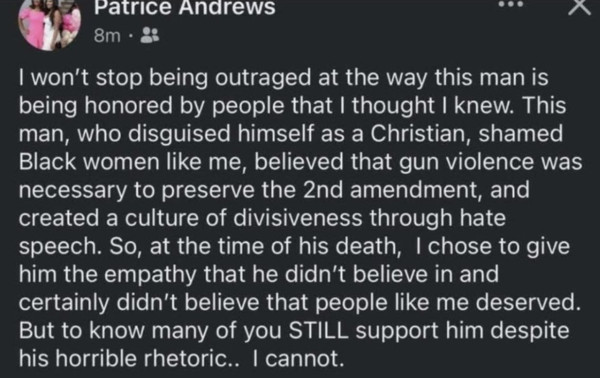 “I won’t stop being outraged at the way this man is being honored by people that I thought I knew. This man, who disguised himself as a Christian, shamed Black women like me, believed that gun violence was necessary to preserve the 2nd amendment, and created a culture of divisiveness through hate speech. So, at the time of his death, I chose to give him the empathy that he didn’t believe in and certainly didn’t believe that people like me deserved. But to know many of you STILL support him despite his horrible rhetoric…I cannot.”