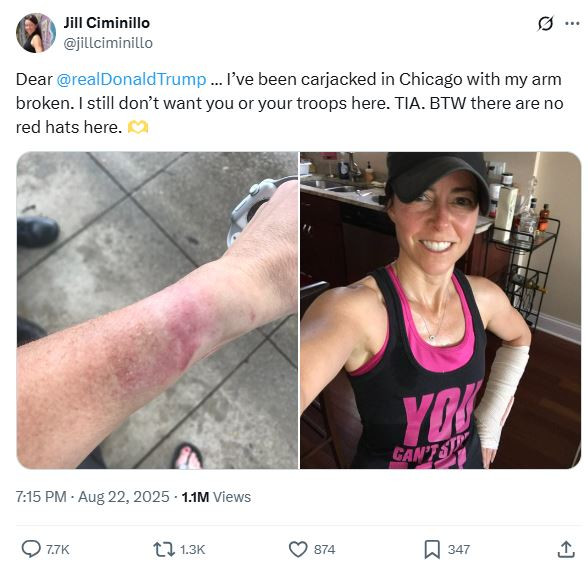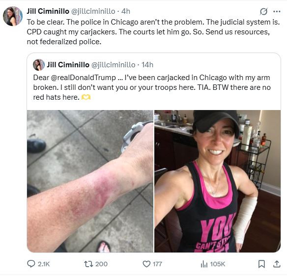 On the same day of President Trump’s comments about Chicago, Ciminillo posted the following on X, “Dear [Donald Trump]…I’ve been carjacked in Chicago with my arm broken. I still don’t want you or your troops here. TIA. [By the way] there are no red hats here.”