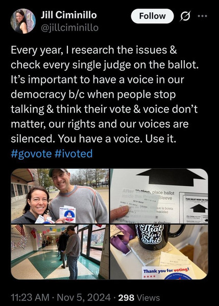 Yet again, Ciminillo was forced to eat her own words, as online sleuths pointed to a November 2024 post where she bragged about how she researches “the issues & check[s] every single judge on the ballot” when casting her vote for local judicial elections.