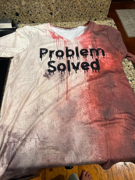 When the order arrived by USPS mail and she opened it, she was shocked by what she found. Instead of the Charlie Kirk tribute shirt, HK found an off-white shirt with the words “Problem Solved” emblazoned on it, with what appeared to be the depiction of blood all over the left side of the shirt. Kirk was shot in the neck, with blood pouring out of his carotid artery onto his shirt on the left side.
