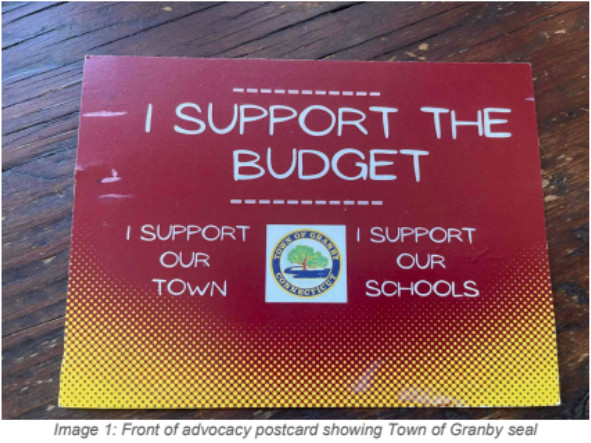 By directing town residents to “fill out postcards” advocating for the Board of Finance to fully fund the education budget, Becker appears to violate C.G.S. 7-421, which says that municipal employees and officials may not use their official authority or position to influence an election or referendum. In this case, the use of the town seal suggests that the position is an official town position and that it is issued with government authority.