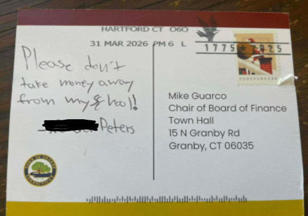 LET received a copy of one postcard sent to Guarco from someone named [redacted] Peters. We will not publish the child’s full name; however, we have been informed that this child is the son of Granby Board of Education Chair Monica Logan. The postcard read, “Don’t take money away from my school!!” Connecting the dots yet?