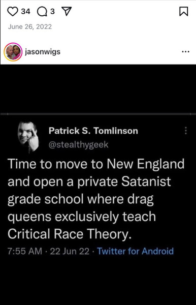 Aside from his swastika post, Hayes shared a post on X in June 2022 where the writer wrote, “Time to move to New England and open a private Satanist grade school where drag queens exclusively teach Critical Race Theory.”