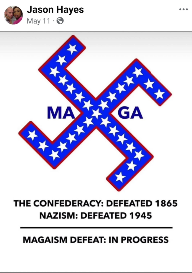 Now the Connecticut Centinal reports that the Democratic first selectman candidate in the upcoming election decided to post what is clearly a swastika with the word “MAGA” emblazoned across it. Below it are the words: “The Confederacy: Defeated 1865,” “Nazism: Defeated 1945,” and “MAGAism Defeat: In Progress. The candidate, Jason Hayes, posted the picture on his social media account, which was captured in a screenshot by East Granby resident Bob Margolis.