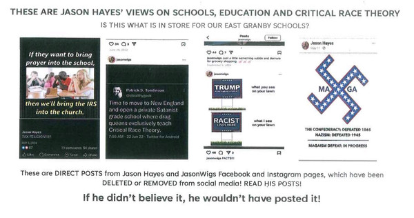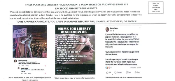 He personally funded a direct mail campaign that went to the homes of everyone in East Granby.... with nothing more than screenshots of Hayes social media posts.
