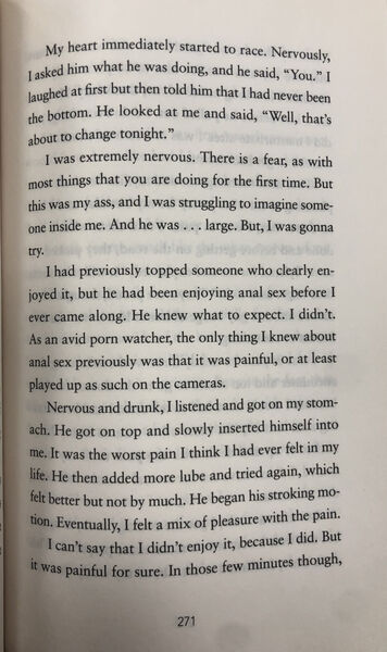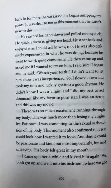 “...So I slowed down and took my time and luckily got into a good rhythm. He didn’t know I was a virgin, and I did my best to act dominant like my favorite porn star. I was an actor, and this was my movie.”