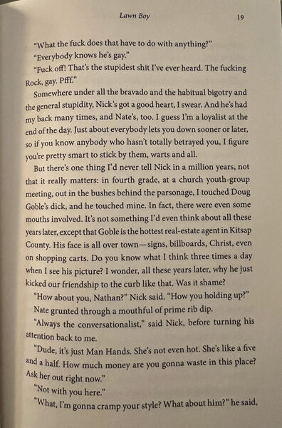 “...in fourth grade, at a church youth group meeting, out in the bushes behind the parsonage, I touched Doug Goble’s dick, and he touched mine. In fact, there were even some mouths involved.”