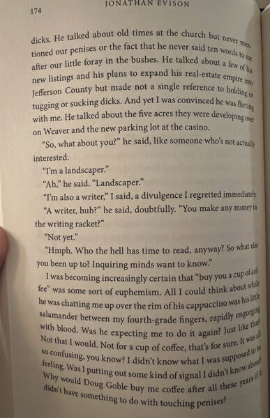 “He talked about old times at the church but never mentioned our penises or the fact that he never said ten words to me after our little foray in the bushes. He talked about a few of his new listings and his plans to expand his real estate empire into Jefferson County but made not a single reference to holding or sugging or sucking dicks.”