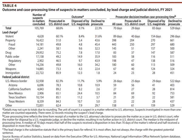 When taking a look at individual crimes, however, the percentage of declined prosecutions is much higher, ranging to over 45 percent. 31.6 percent of violent crimes were not prosecuted. 43.6 percent of property crimes were not prosecuted. And this is after an additional 9 percent were “disposed” by a US Magistrate.