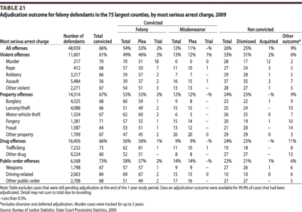 From the Bureau of Justice Statistics, we get a glimpse of outcomes for state felonies. The report does not deal directly with prosecutions, only convictions. I assume that most dismissals were based on prosecutors declining to proceed based on a lack of evidence or uncooperative witnesses.