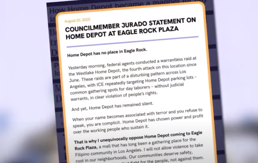 “I unequivocally opposed Home Depot coming to Eagle Rock Plaza, a mall that has been a gathering place for the Filipino community in Los Angeles. I will not allow violence to take root in our neighborhoods. Our communities deserve safety, dignity, and businesses that fight for the people, not against them,” Jurado wrote.