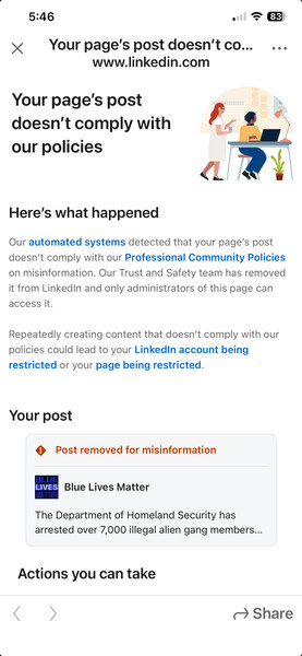 Early in February, the article was “flagged by LinkedIn’s automated systems” for misinformation and removed by the “Trust and Safety” team. The article’s removal was accompanied by a message with an ominous warning that creating content that “doesn’t comply with our policies” could lead to the account or page being restricted.