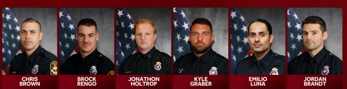 The injured officers were identified as Sgt. Emilio Luna, who suffered a gunshot wound to his foot; Det. Brock Rengo, who suffered a bullet graze to his leg; Det. Jordan Brandt, who sustained a gunshot wound to his leg; Det. Christopher Brown suffered a shrapnel injury to his foot, police said. Two other officers, Det. Kyle Graber and Sgt. Jonathon Holtrop, were reportedly not injured during the melee.