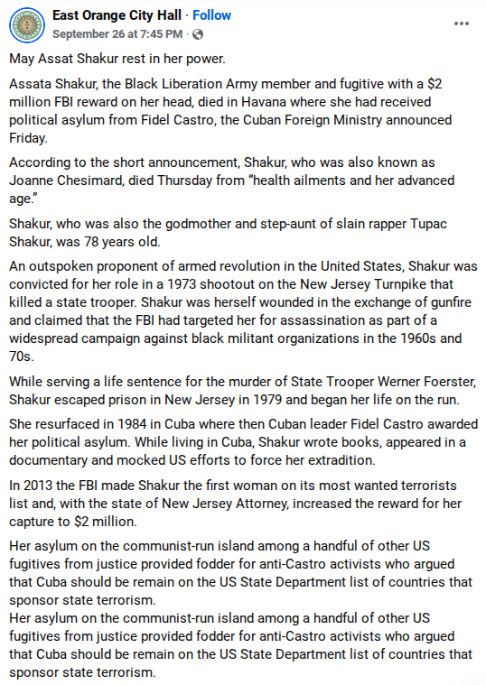 Not East Orange, New Jersey, however. In a Facebook post, the city hall quoted a CNN article about Chesimard’s death with a caption on top reading, “May Assat [sic] Shakur [Chesimard] rest in her power.” One might think that if you’re going to honor a murdering savage, you might get her name correct. Clearly, whoever is running the city’s social media page is an uninformed stooge.